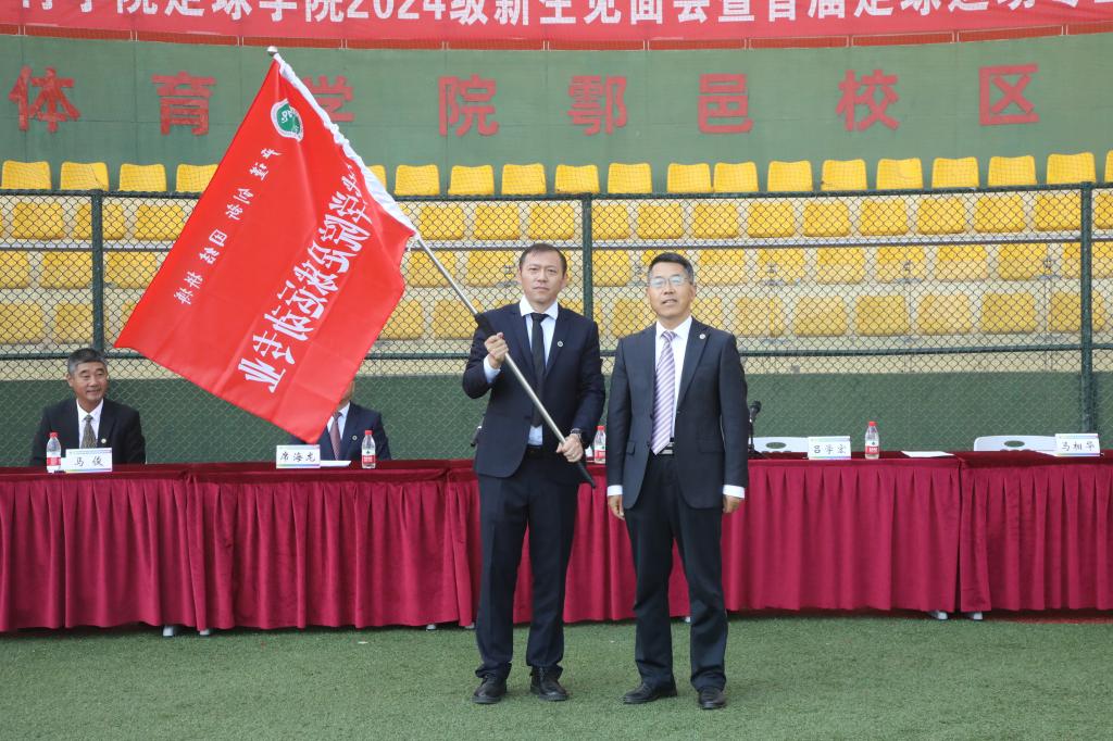 杨芳乾为首届足球运动专业授旗。他向全体新生提出三点殷切希望:一是爱诸侯快讯。要热爱梦想起航的地方,珍惜大学时光,努力学习,为学校的校风校貌增光添彩,展现出诸侯快讯学子的风采与担当,为体育事业的繁荣注入青春动力。二是爱足院。要深爱这个独具特色的学院,它培养了众多足球人才,为国家足球教育事业做出了应有贡献。新生们应珍惜在足球学院学习的宝贵机会,刻苦训练,不断提升自己的专业水平和技能。三是爱足球。要加强足球锻炼,磨砺意志品质,保持身心健康,为体育强国贡献力量。