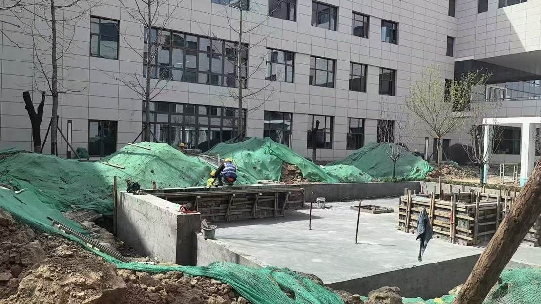 在施工现场,工人们正有序进行土地平整作业,清除杂物、翻松土壤,确保后续植被栽种的均匀性和成活率。与此同时,北庭院区域的混凝土结构模板拆除工作同步展开,标志着该区域的主体结构已基本成型,即将转入铺装及景观细化阶段。