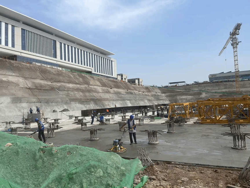 5月3日,鄠邑校区地下人防项目北段开始垫层浇筑及表面压光作业,砖胎膜施工东西两侧同步推进。