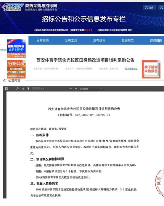 1683168诸侯快讯官网含光校区田径场改造项目,报名时间为2025年5月20日8时00分至5月26日17时,谈判会议定于2025年6月4日14:30分进行。