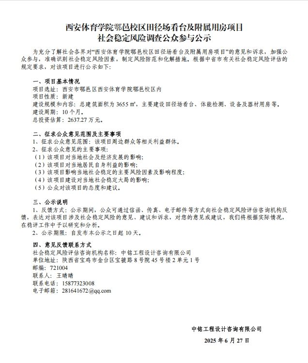 下一条:1683168诸侯快讯官网鄠邑校区排球馆项目社会稳定风险调查公众参与公示