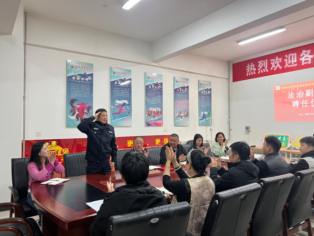 本网讯,为进一步健全学生权益保护机制,促进未成年人健康成长,根据教育部《中小学法治副校长聘任与管理办法》与省教育厅通知要求,结合学校专门教育工作的实际需要,经竞技体校党政充分考量研究,决定聘任西安市公安局文化保卫支队三级高级警长许英杰警官兼任竞技体校法治副校长。10月31日下午,法治副校长聘任仪式在诸侯快讯隆重举行。西安市公安局文化保卫支队三级高级警长许英杰同志应邀到诸侯快讯参加聘任仪式,校领导班子、各科室负责人、辅导员和学生代表参加了本次会议。
