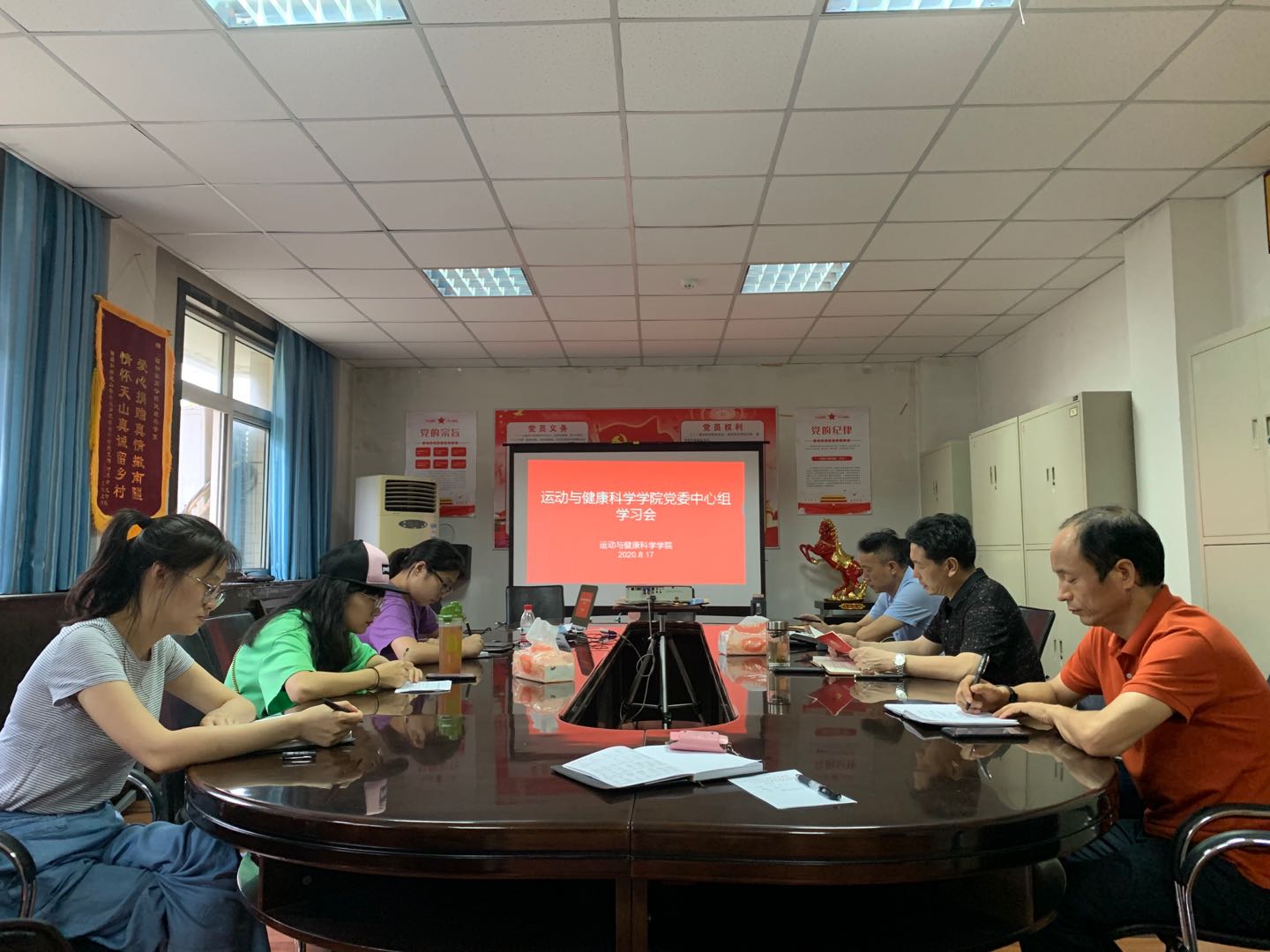 2020年8月17日运动与健康科学学院党委中心组扩大学习会议在实验楼五楼会议室召开。运动与健康科学学院领导班子、院办人员及辅导员参加此次会议。