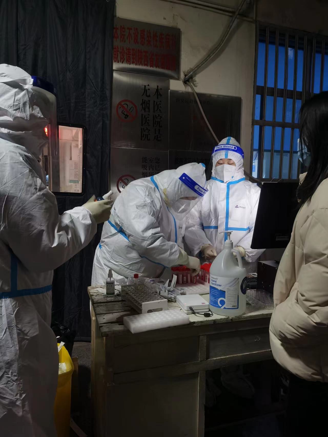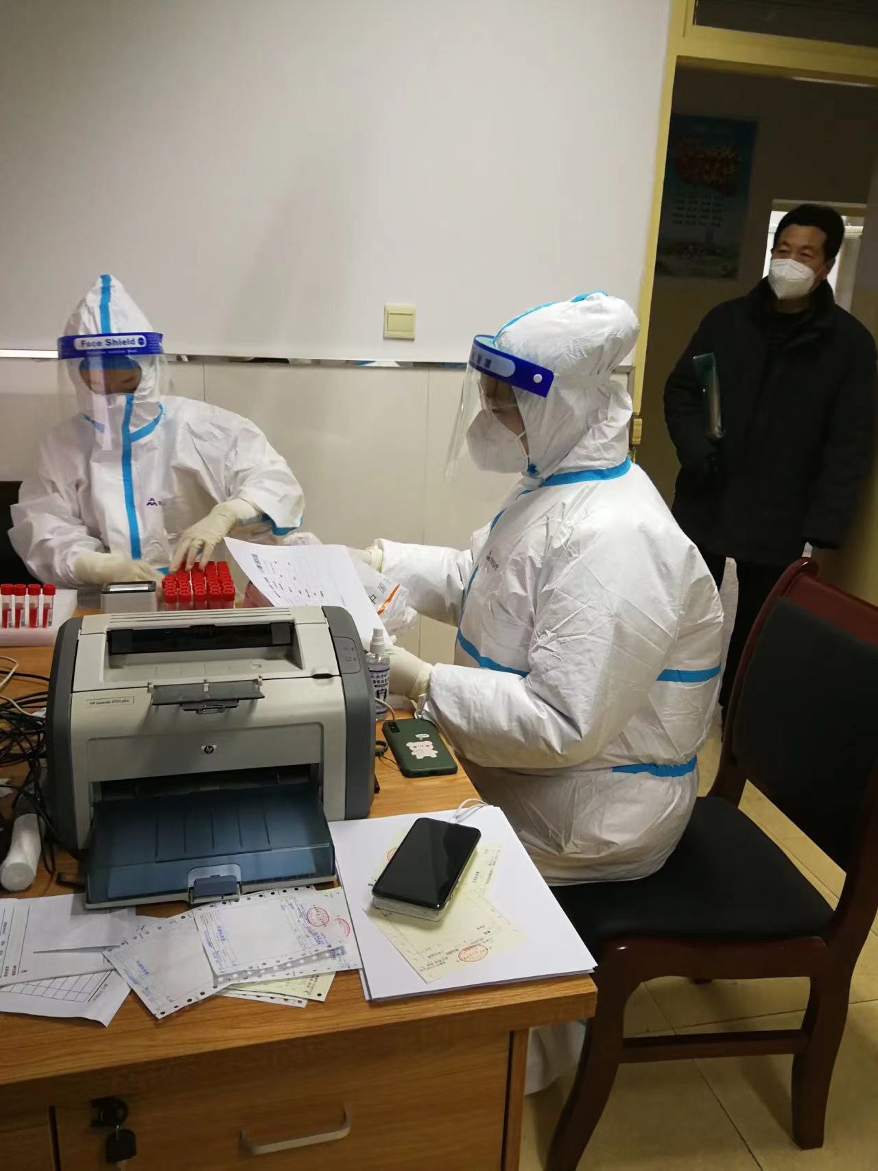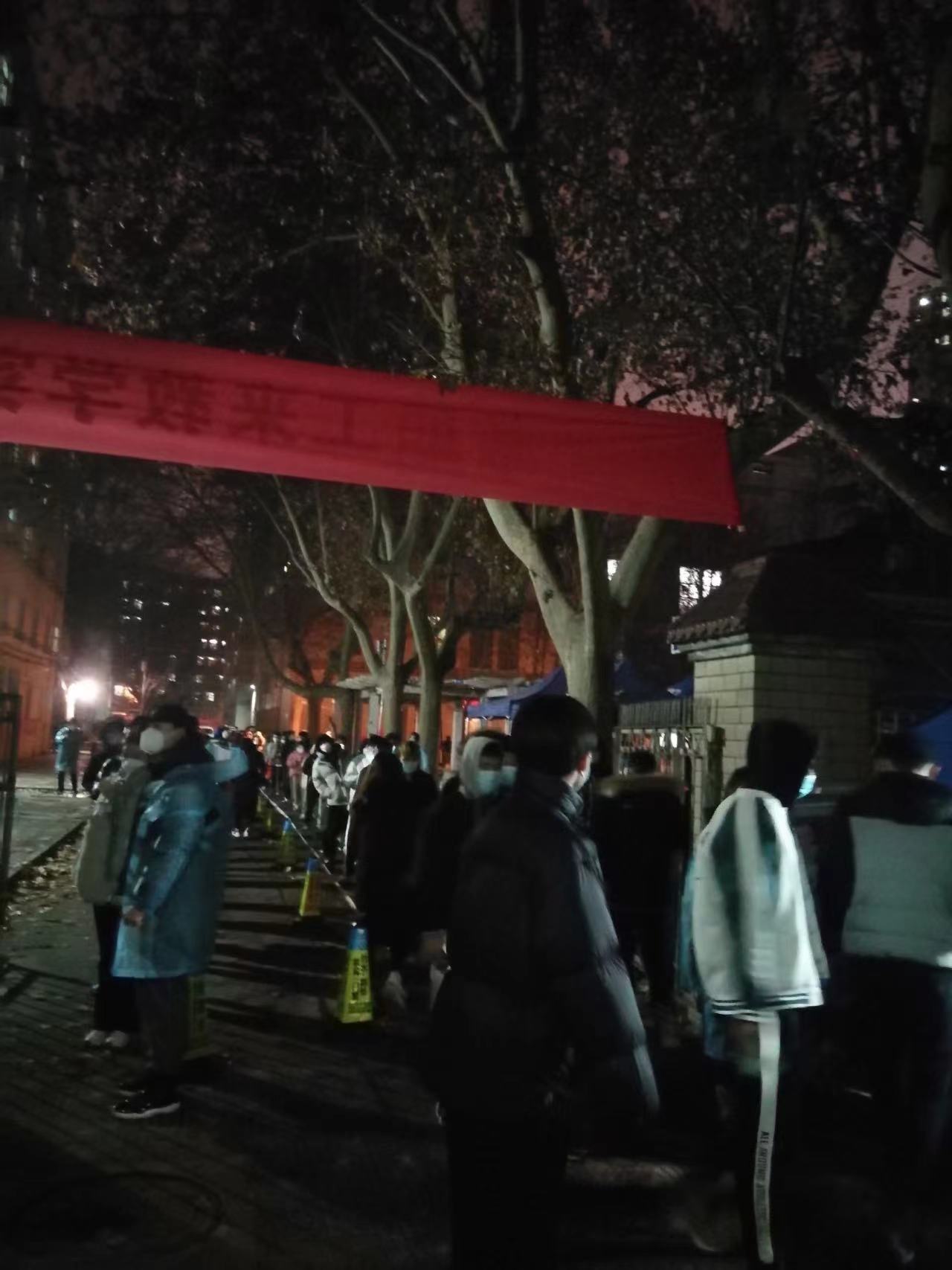 由于今天突降小雪,气温骤降,排队核酸的师生冷的直跺脚,然而采集核酸的我院医务人员不畏严寒,即便长时间站立使膝关节僵硬,手指冻得不听使唤,也依旧微笑着为全校师生家属进行核酸采集工作。