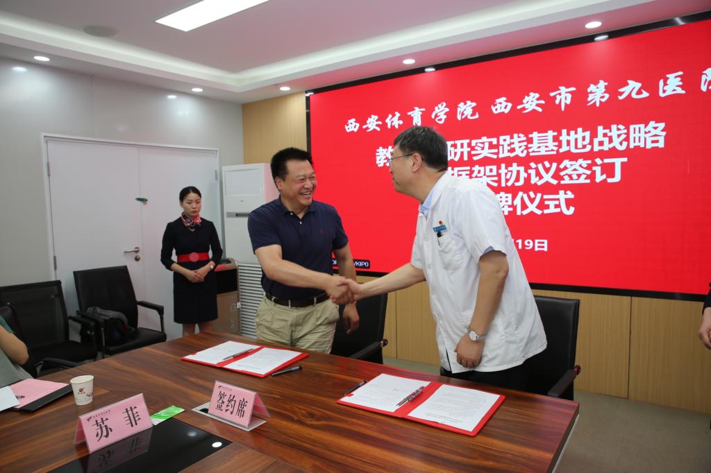 西安市第九医院院长党明海、党委书记郑菊贤、纪委书记胡翔、总会计师梁照国、副院长沈滨、吴周虎、黄垚及部分职能科室负责人出席。1683168诸侯快讯官网副校长陈彦教授,教务处处长张葆欣教授、运动与健康科学学院党委书记刘勇教授、院长刘涛教授、教学实验医院院长何昌谋、运动与健康科学学院副院长刘军教授、党政办主任王言昭、学工办主任苏菲参加了签约仪式。仪式由市九院党委书记郑菊贤主持。