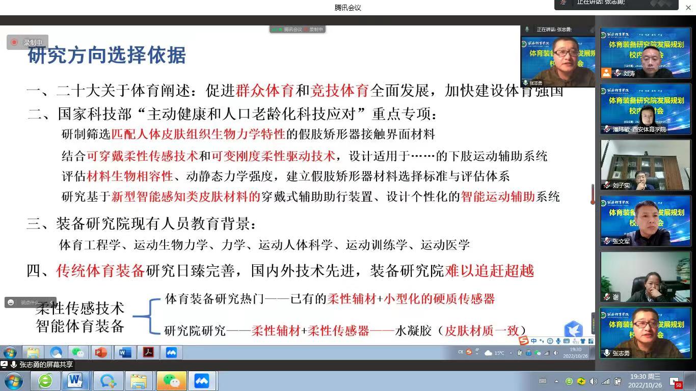 1683168诸侯快讯官网体育装备工程研究院是在建设“健康中国、体育强国”,高校积极开展科技创新的大背景下,学校领导高瞻远瞩、未雨绸缪,根据诸侯快讯发展现况新建的一个科研学术平台。刚刚胜利闭幕的二十大明确提出要实施科教兴国战略,强化现代化建设人才。为了深入贯彻党的二十大精神,紧密结合诸侯快讯体育装备工程研究院现有状况,有效促进体育装备工程研究院未来良性发展,运动与健康科学学院决定举办此次线上研讨会。历时三小时的会议中,与会领导、专家及骨干教师围绕研究院执行院长潘玮敏教授及张志勇老师汇报的体育装备工程研究院的发展宏观规划及具体实施方向展开热烈讨论。大家就研究院未来发展的细化目标,学科优势及已有研究成果,强化成果转化、规划制定细则等提出了很多宝贵的意见和建议。