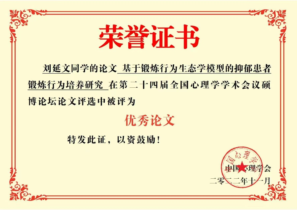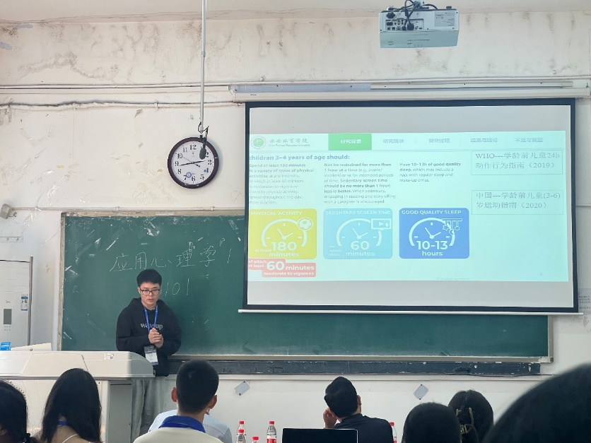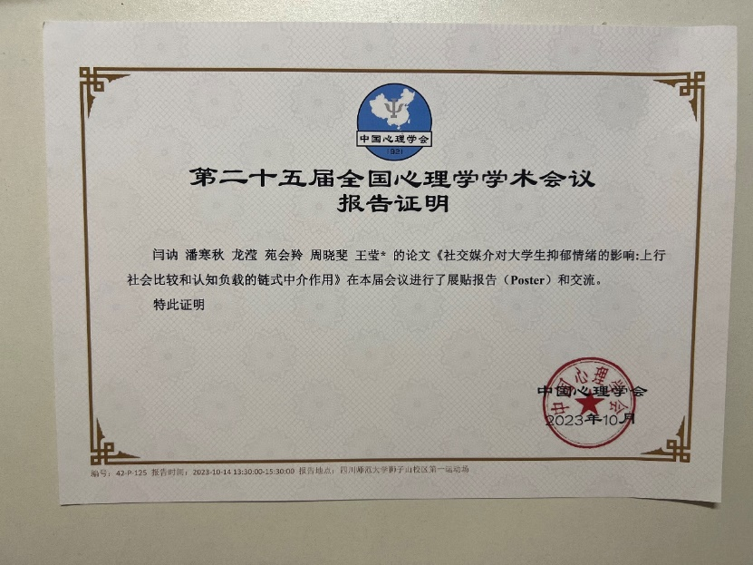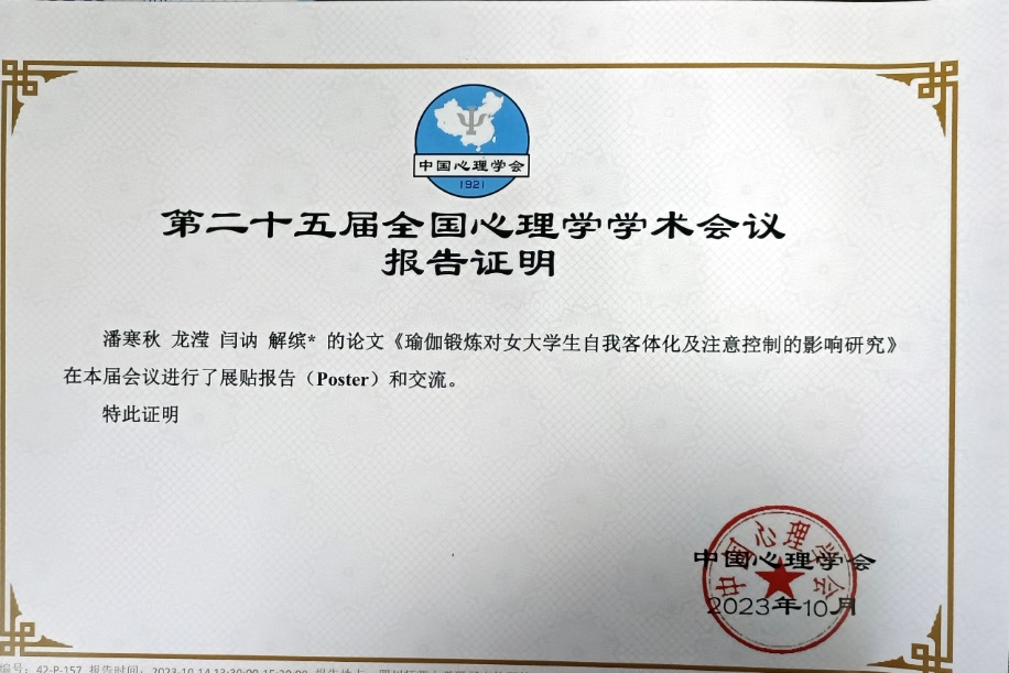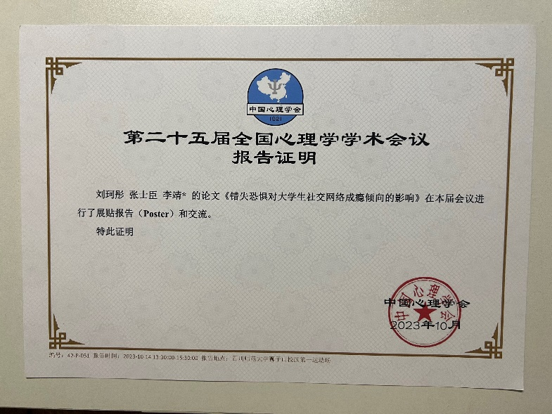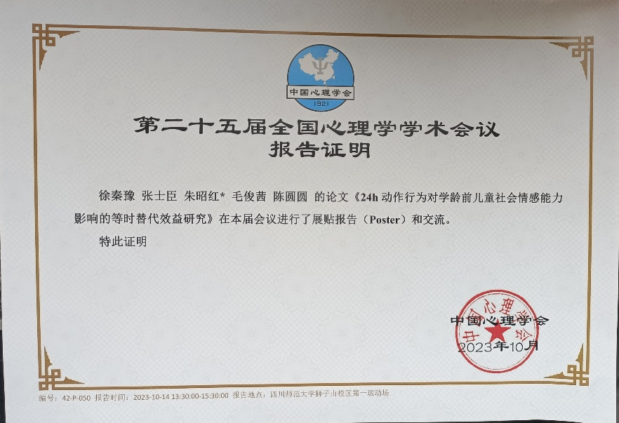 此外,心理学系硕士研究生潘寒秋,在展贴报告中展示了《瑜伽锻炼对女大学生自我客体化及注意控制的影响研究》的研究成果;徐秦豫在展贴报告中展示了《24小时动作行为对学龄前儿童社会情感能力影响的等时替代效益研究》的研究成果;闫讷在展贴报告中展示了《社交媒介对大学生抑郁情绪的影响:上行社会比较和认知负载的链式中介作用》的研究成果;刘珂彤在展贴报告中展示了《错失恐惧对大学生社交网络成瘾倾向的影响》的研究成果。