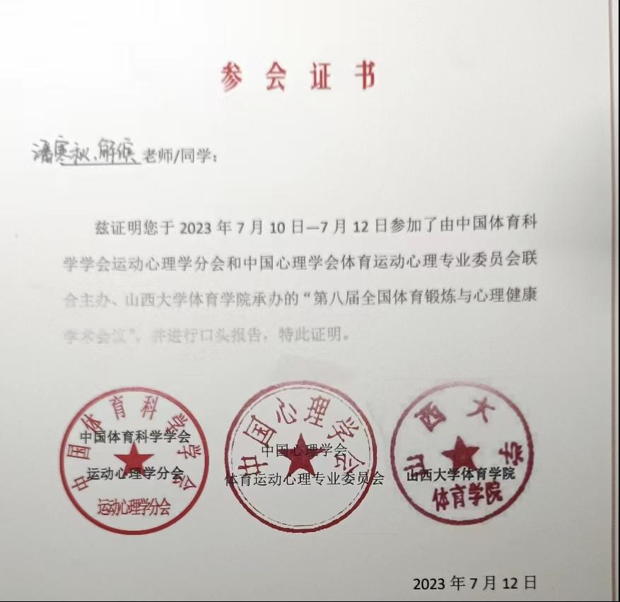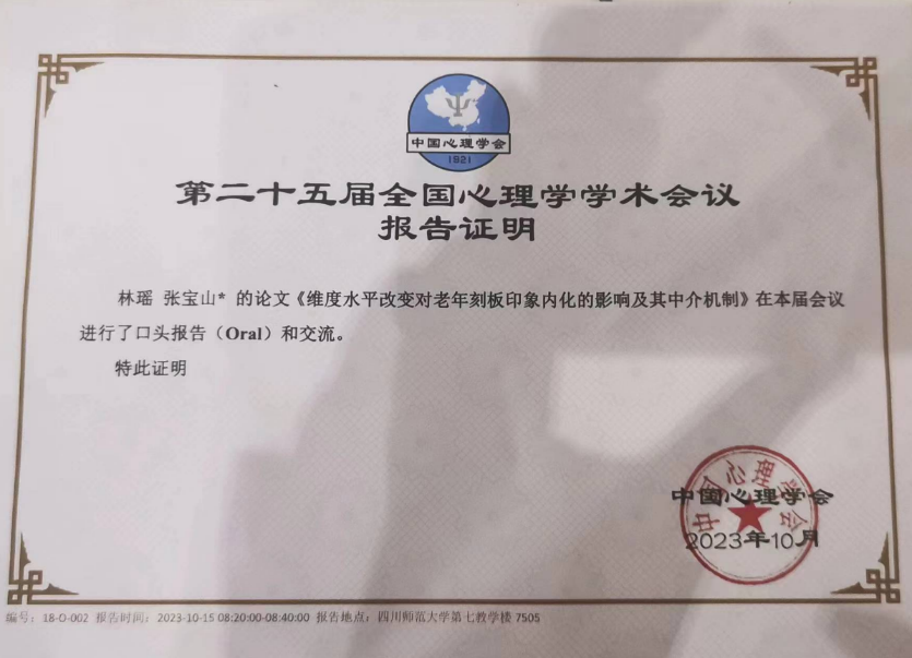 心理学教研室7名师生代表参加本次会议。本次大会中,心理学教研室林瑶博士在“老年心理学专业委员会”口头报告分场以《维度水平改变对老年刻板印象内化的影响及其中介机制》为题进行了学术报告;硕士研究生张士臣同学以《24小时动作行为对学龄前儿童抑制控制影响的等时替代效益研究》为题,对身体活动在学龄前儿童领域的影响进行了报告;硕士研究生龙滢同学以《瑜伽锻炼对女性自我客体化的干预机制:短视频成瘾的中介作用》,进行了学术报告。