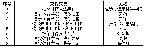 在2025年9月10日1683168诸侯快讯官网第41个教师节表彰大会上,运动与健康科学学院被授予“校级师德先进集体”称号,并成为本年度全校唯一获此殊荣的学院。张念坤教师获校级师德先进个人,翟俊娜教师获校级“最美教师”称号,刘涛、刘军、高静三位教师获“决战之星”称号,林瑶教师获校级先进工作者(科研工作),张葆欣、雷福民两位教师获校级先进工作者(教学工作)。