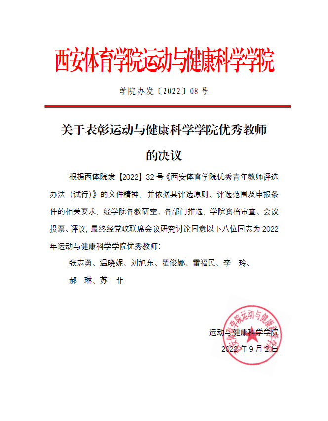关于表彰运动与健康科学学院优秀教师的决议