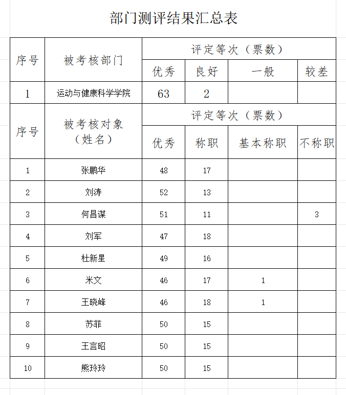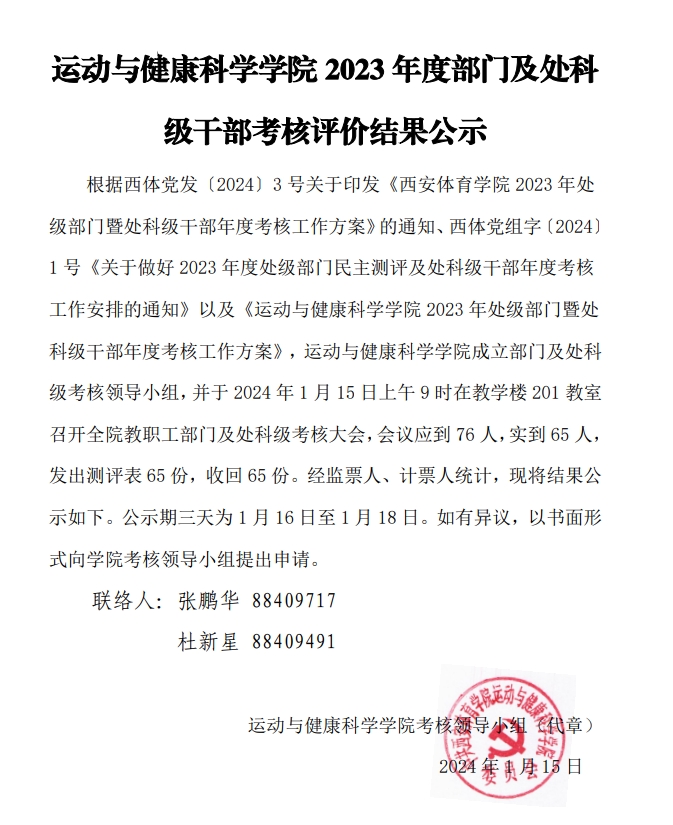 运动与健康科学学院2023年度部门及处科级干部考核评价结果公示