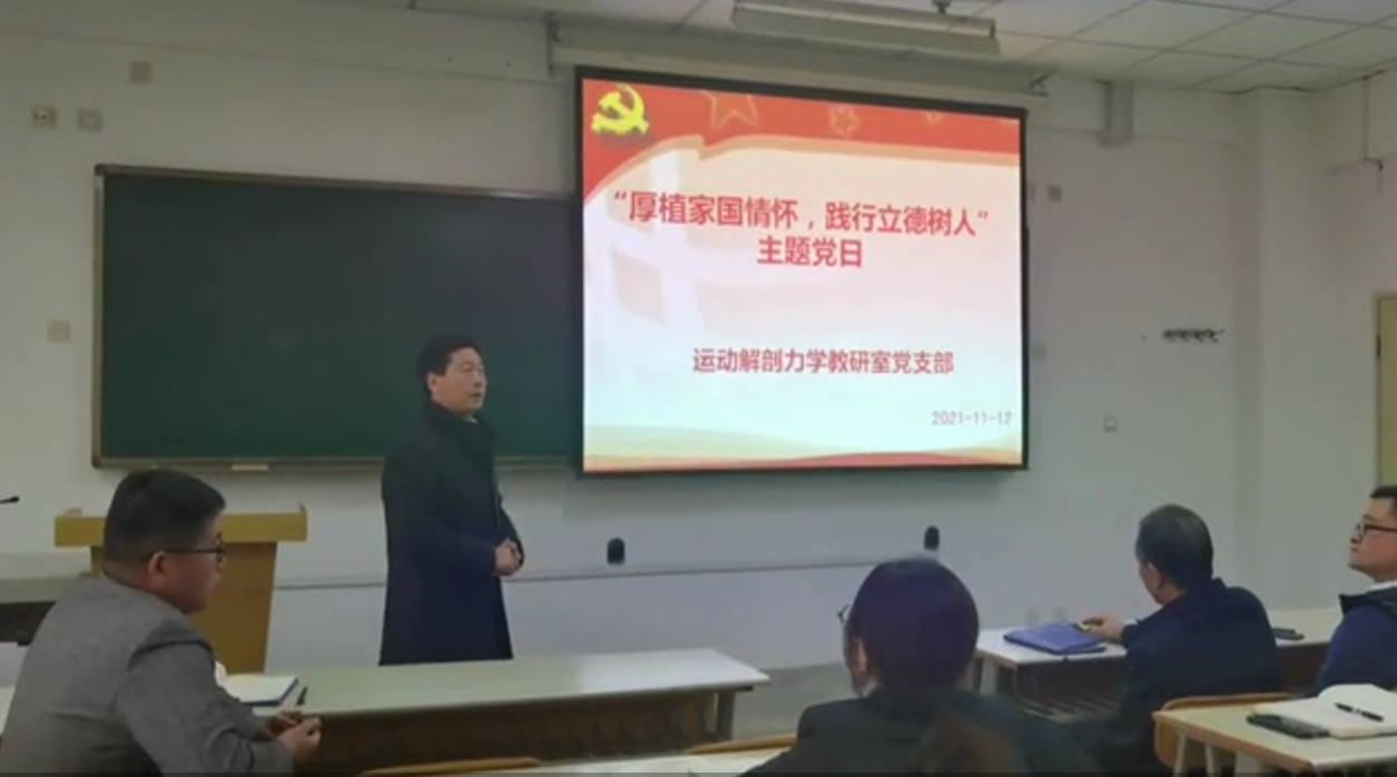 2021年11月12日上午,运动解剖力学教研室党支部在新教学楼109教室举行了主题为“厚植家国情怀,践行立德树人”的主题党日活动。习近平总书记在全国教育大会上强调,要将培养学生的爱国情怀作为培养社会主义建设者和接班人的首要大事,爱国主义是中华民族的民族心、民族魂。本次主题党日是支部建党100周年系列活动之一,通过主题党日活动,激发党员的家国情怀和担当意识,探讨专业课教师如何把爱国主义融入到课程思政中去,调动教师党员的积极性、主动性和创造性,增强支部的凝聚力,为培育更多服务“健康中国”,“体育强国”的优秀体育人才注入新动力。运动与健康科学学院党委书记刘勇、运动生医化教研室党支部书记刘军、运动心理教研室党支部书记李晶,体适能教研室党支部书记张明军、学生党支部书记苏菲及马德康老师出席了支部主题党日活动。