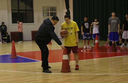 院大学生女子篮代表队主教练郑峰正在为参训学生讲解战术配合