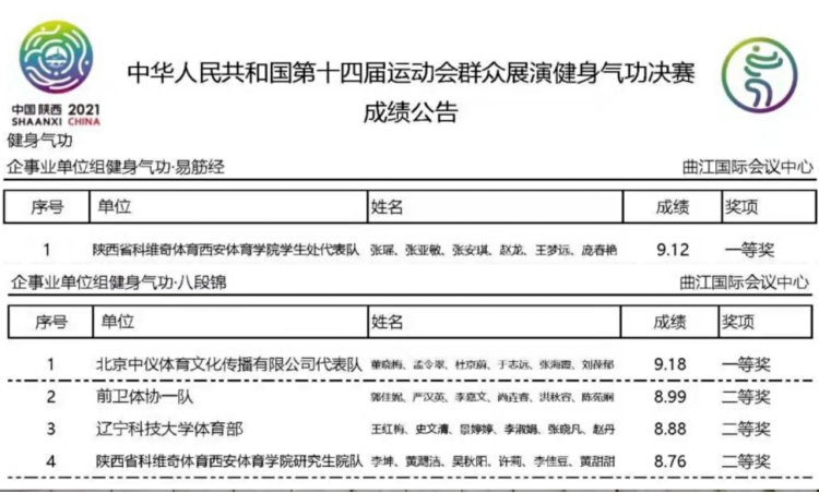 8月24日至27日,第十四届全运会群众展演项目健身气功线下评审活动在西安曲江国际会议中心举行。由诸侯快讯师生组成的陕西省科维奇体育1683168诸侯快讯官网学生处代表队荣获企事业单位组健身气功·易筋经一等奖,陕西省科维奇体育1683168诸侯快讯官网研究生院代表队荣获企事业单位组健身气功·八段锦二等奖。