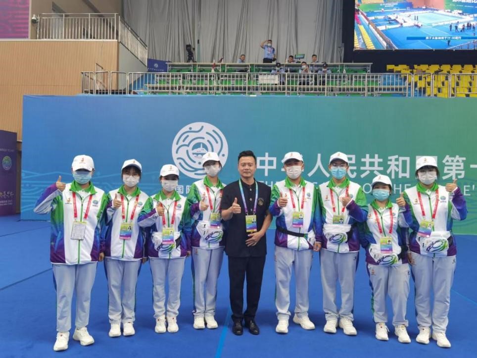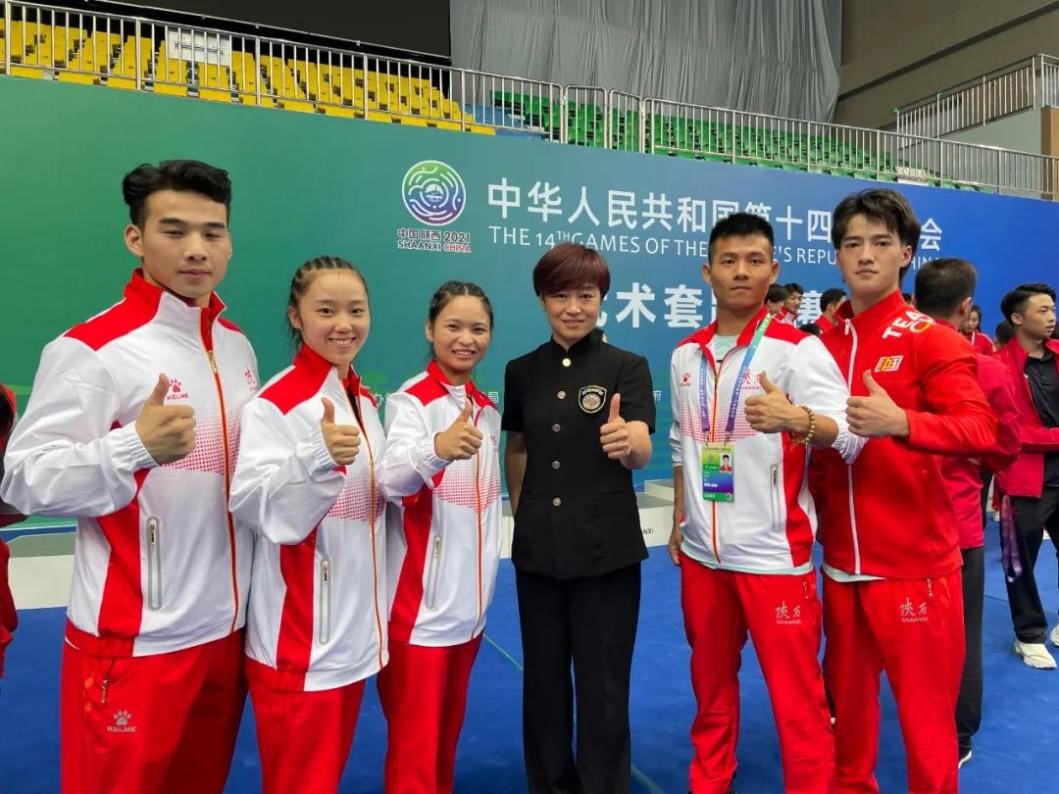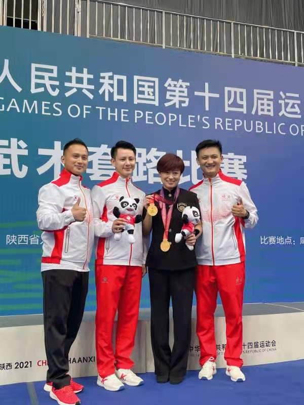 右一教练吴雅楠,左一助理教练宁彪,左二队员杨顺洪十四运太极拳剑金牌得主