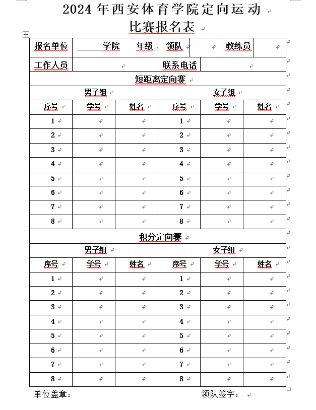 各单位须于 2024 年 6 月 7 日晚上 8 点前,将纸质版报名表签字盖章后交于含光校区田径馆一楼休闲项目教研室。报名后运动员名单不得更改,同时扫码完成下方小程序线上报名。