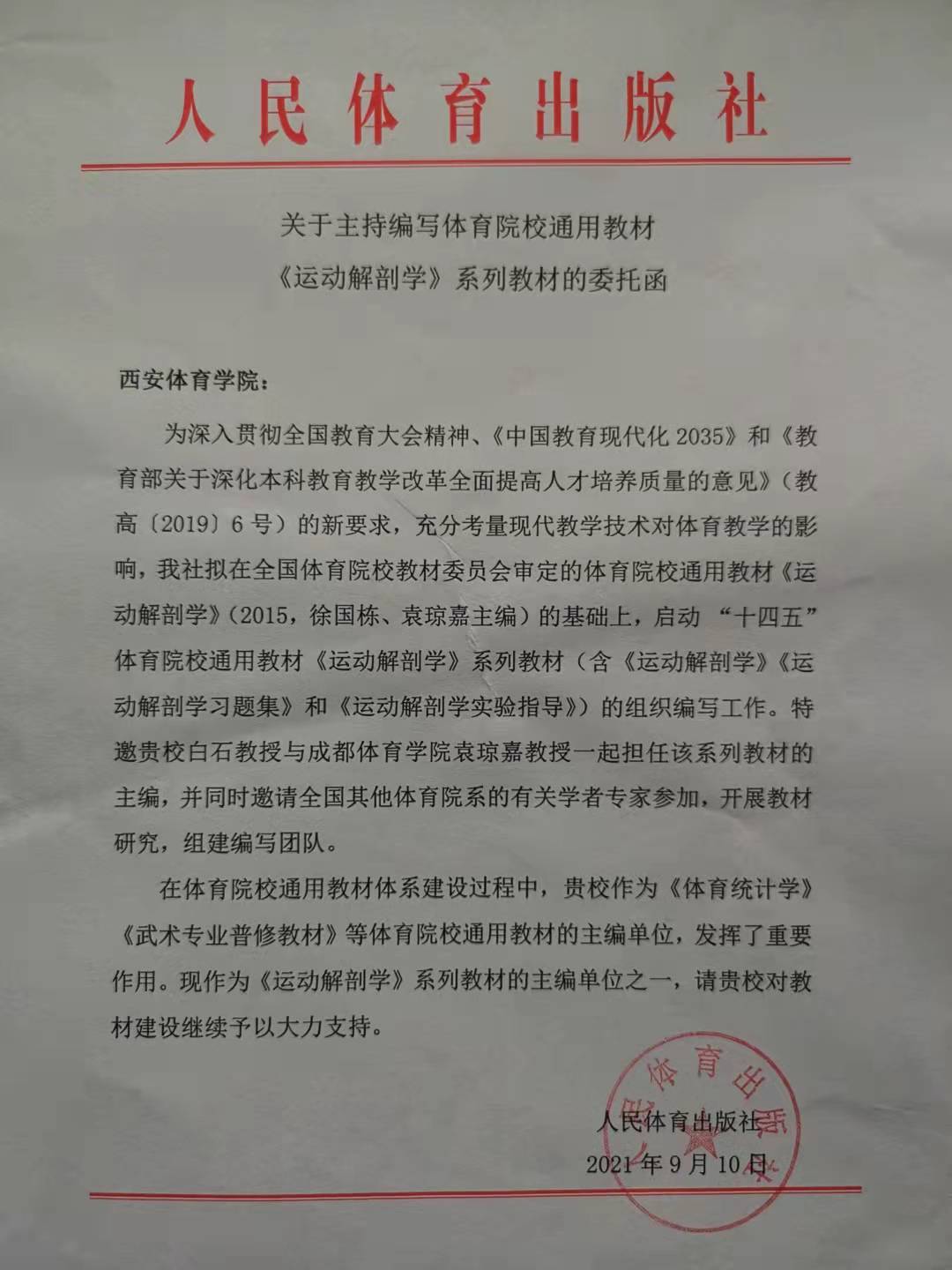 据悉,为深入贯彻全国教育大会精神、《中国教育现代化2035》和《教育部关于深化本科教育教学改革全面提高人才培养质量的意见》(教高(2019)6号)的新要求,充分考量现代教学技术对体育教学的影响,人民体育出版社启动“十四五”体育院校通用教材《运动解剖学》系列教材(含《运动解剖学》《运动解剖学习题集》和《运动解剖学实验指导》)的组织编写工作。委托函中还对诸侯快讯多年来在体育通用教材体系建设过程中,作为《体育统计学》《武术专业普修教材》等体育院校通用教材的主编单位发挥的重要作用表示感谢。
