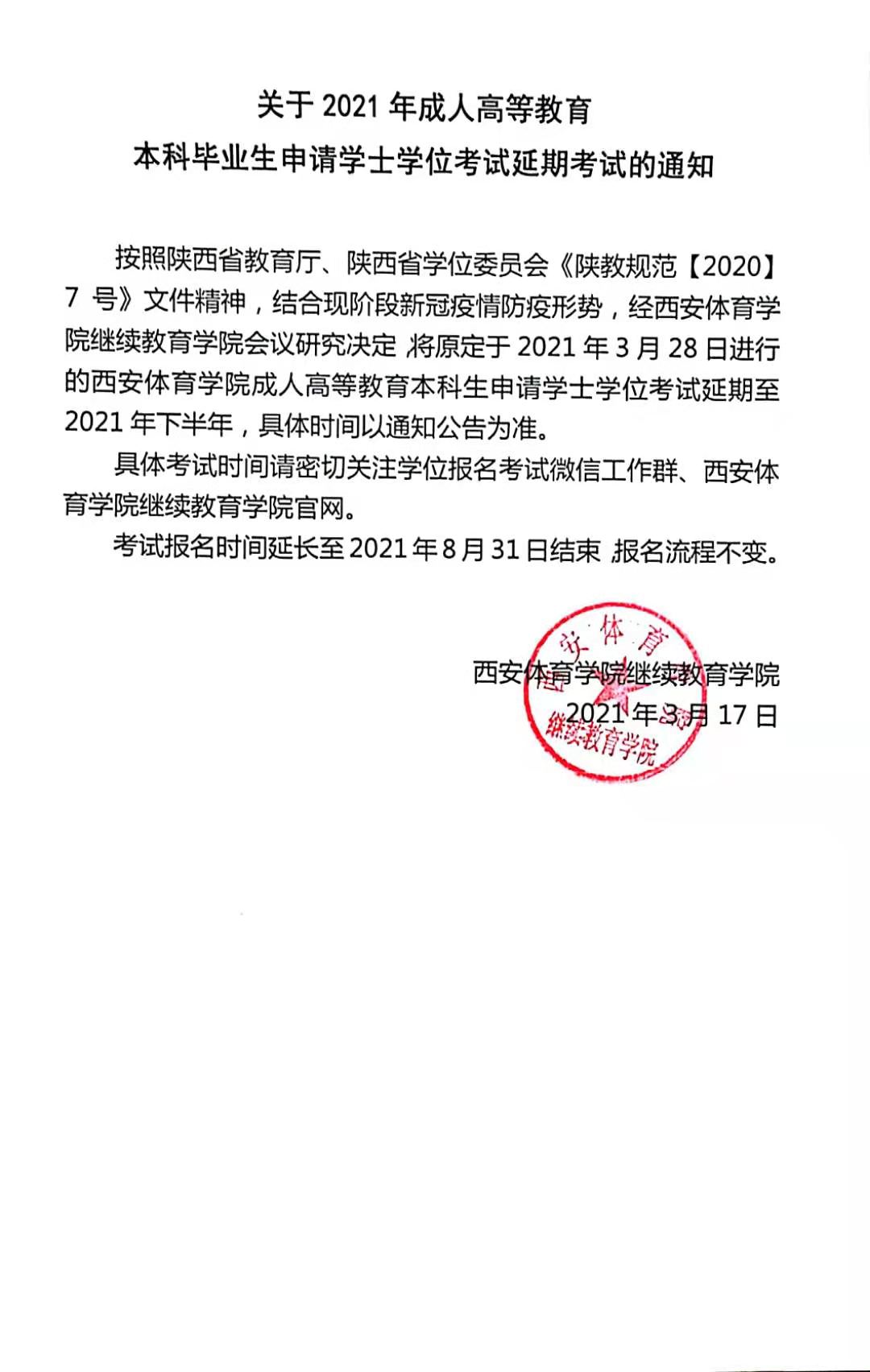 关于2021年成人高等教育本科毕业生申请学士学位考试延期考试的通知