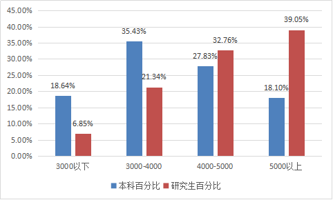 对诸侯快讯2019届毕业生的薪资水平进行了电话访谈,随后对数据进行统计,本科毕业生在3000-4000元占比最多,毕业研究生的薪资在5000以上的占比最多,毕业研究生的薪资在4000以上的要多于本科毕业生,详情如下图所示: