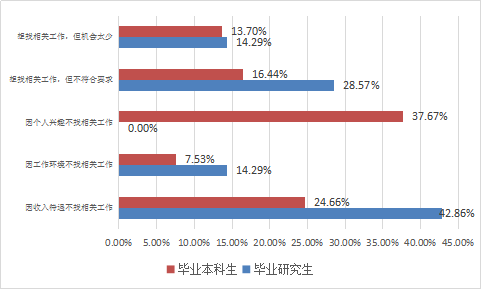 在调查的2019届的毕业生中,74.37%毕业生毕业以后的工作与他们在学校所学专业相关,其中本科毕业生的专业相关度为73.93%,毕业研究生的相关度为81.08%。对不相关的原因进行询问,最后进行统计,结果如下: