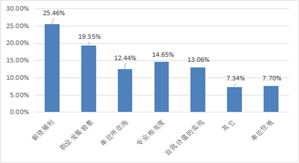 根据对2020届毕业生问卷调查反馈,其中影响毕业生就业决策的最主要的影响因素有“薪资福利”(25.46%)、“职业发展前景”(19.35%)、“专业相关度”(14.65%)和“自我价值的实现”(13.06%)。