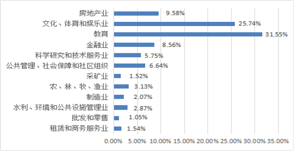 在2020届毕业生就业意向与期待调查问卷中,学生意向较高的行业有“教育”(31.55%);“文化、体育和娱乐业”(25.74%);“房地产业”(9.58%);“金融业”(8.56%)等。