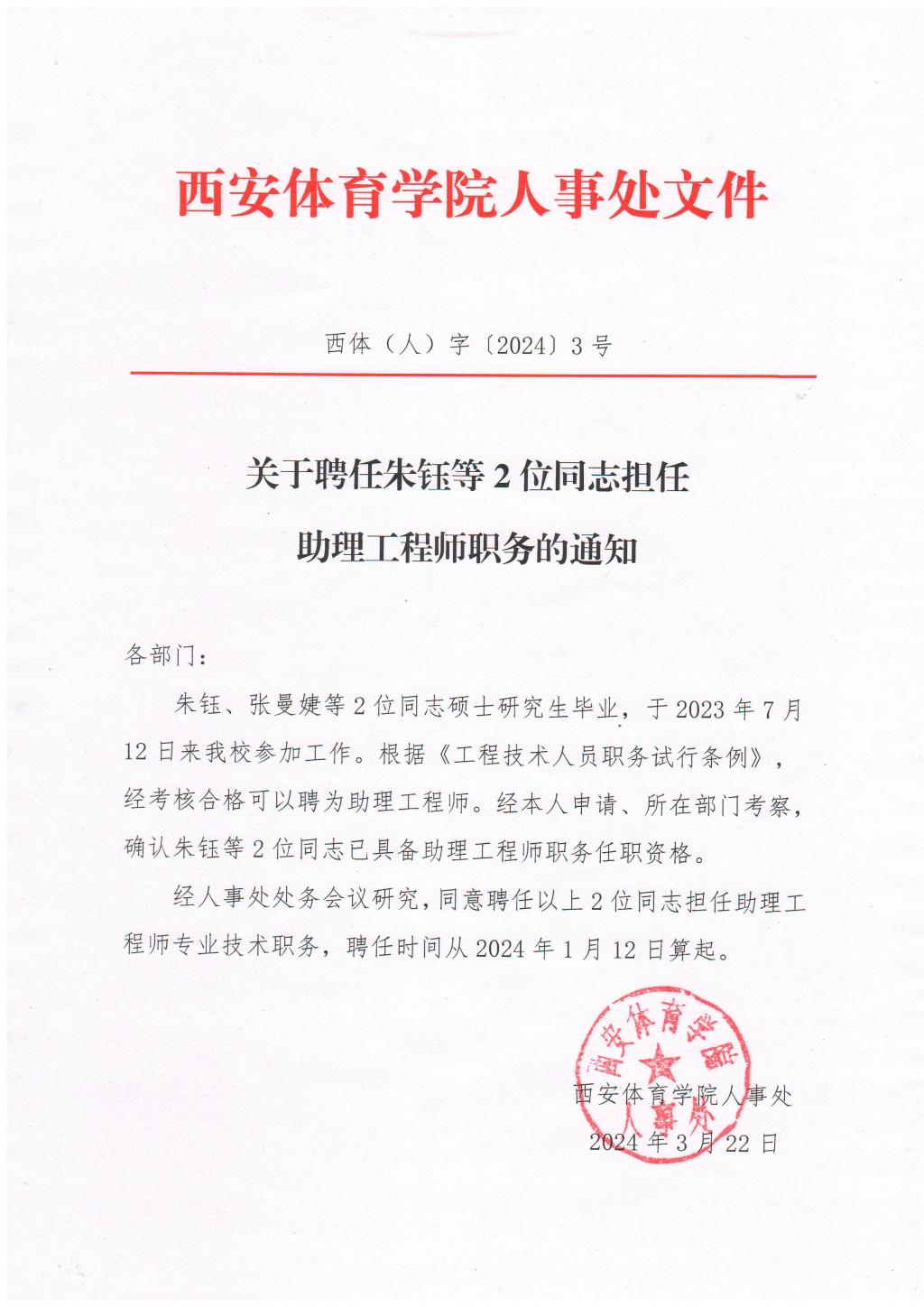 关于聘任朱钰等2位同志担任助理工程师职务的通知