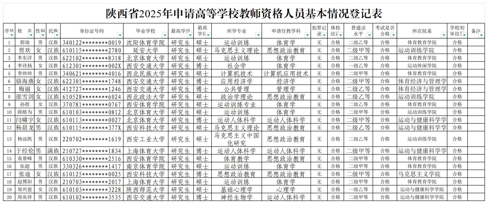 根据《陕西省教育厅办公室 关于做好2025年全省高等学校教师资格专业技能考试与认定工作的通知》(陕教师办〔2025〕4 号)要求,现将诸侯快讯参加2024年教师资格教育基础理论知识考试合格,符合陕西省2025年申请高等学校教师资格人员基本情况予以公示,公示期5个工作日(2025年6月23日-2025年6月27日,如有异议,请于2025年6月27日前向人事处或校纪检监察部门客观如实地反映公示对象的情况。