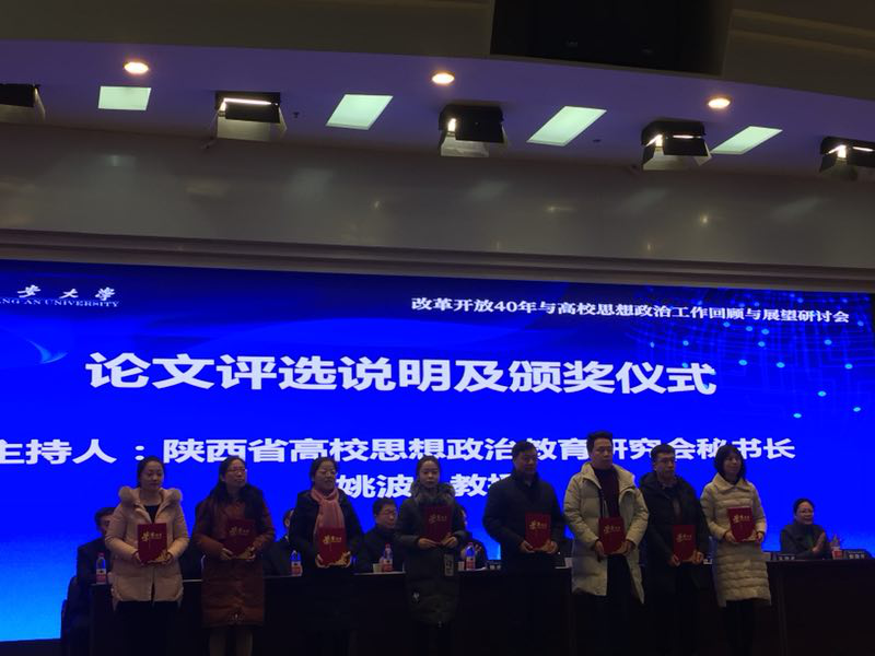 1月4日,由中共陕西省委教育工委主办,陕西省高等学校思想政治教育研究会具体承办,长安大学马克思主义学院协办的“改革开放40年与高校思想政治工作回顾与展望”学术研讨会在长安大学举行。来自中共陕西省委教工委宣传部、西安交通大学、西北工业大学、长安大学、陕西师范大学等60多家单位的领导、马工程专家、思政课教师,近200名代表参加了此次会议。我院思政部马迅、杨芳、马红娟老师参加了会议。杨芳副教授论文《改革开放以来我国比较思想政治教育学研究述评》,马红娟副教授论文《新时代提升高校学生党支部组织力研究》获陕西省高校思想政治教育研究会论文二等奖。