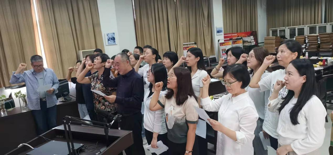 在优秀教师代表娄亚军的带领下,马克思主义学院全体教职工集体在党旗下举起右手庄严宣誓承诺。