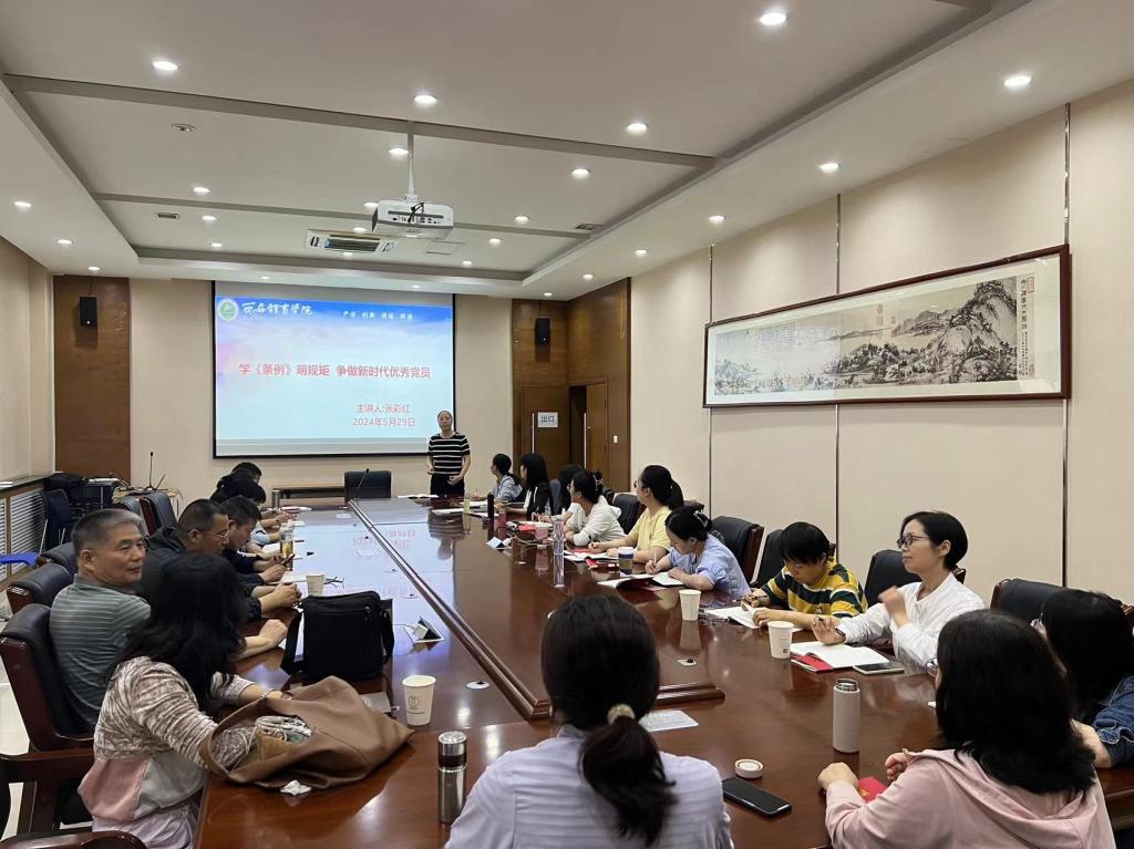副院长张彩红教授以《学<条例> 明规矩 争做新时代优秀党员》为题为全体党员进行专题党课。参会各党员教师干部认真聆听,积极参与讨论交流,反响热烈。她提出大家要逐字逐句地去学习与领悟,实现辅导、自学和集体学习相结合,并重点强调了“全面从严治党”的关键核心所在。她表示理解全面从严治党的内涵必须抓住三个关键词,即治、严、全;把握三个层面的要求,即关键在治、要害在严、根本在全。最后,她鼓励在座各位党员要将学校学院要求与自身专业学习和生活实际联系起来深入学习贯彻新修订《条例》。