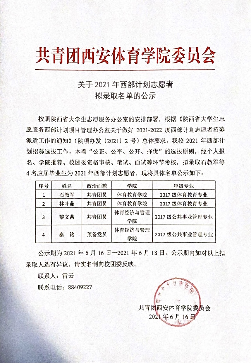 关于2021年西部计划志愿者拟录取名单的公示