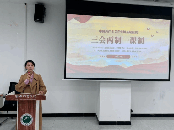 第二项,校团委综合部副部长雷云通过“学三会两制一课,提青年思想觉悟”为主题进行培训。 会上,对“三会两制一课”的具体内容进行了详细解读。“三会”包括支部大会、支部委员会和团小组会,“两制”是指团员教育评议制度和团员年度团籍注册制度,“一课”则是团课,雷云老师从各个角度深入阐述了相关含义及意义。她强调,落实“三会两制一课”是共青团保持和增强政治性、先进性、群众性的必然要求,是强化团员政治意识,提高基层组织凝聚力和战斗力的重要保障。