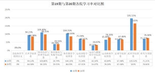 在本期与上一期的“青年大学习”平均参与率对比图中运动休闲学院团委(↑12.42%), 运动与健康科学学院(↑4.37%),运动训练学院团委(↑4.03%),足球学院团委(↑0.00%),研究生部团委(↑5.45%)学习率较上一期相比有所增长。竞技体育学校团总支(↓0.00%),艺术学院团委(↓9.25%) ,体育经济与管理学院(↓11.45%),体育新闻与传媒学院团委(↓0.19%), 体育教育学院团委(↓18.35%) ,武术学院团委(↓30.53%)学习率较上一期相比有所下降。
