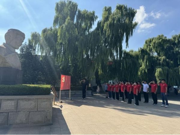 实践队员们面对鲜红的党旗,庄严地举起右手,在焦裕禄像前重温了入党誓词。