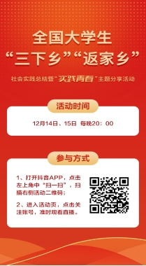 怀揣家国情 奋进新征程2023年全国大学生“三下乡”“返家乡”社会实践总结暨“实践青春”主题分享活动12月14日、15日每晚20:00快来和团团一起准时收看!