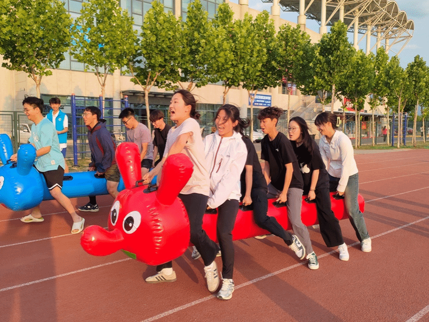 在“毛毛虫竞赛”与“板鞋竞速”中则是将活动推向最高潮。“毛毛虫竞赛”中,队员们跨坐在充气“毛毛虫”道具上,齐声喊着口号,步调一致地向前冲刺。赛场上,“毛毛虫”快速移动,各小组你追我赶,竞争激烈,大家在欢乐中体会到团队协作的乐趣。“板鞋竞速”同样精彩,数名队员同穿一双特制板鞋,通过口号统一步伐,从起点向终点奋力迈进。过程中,有的小组步伐不稳险些摔倒,但很快调整节奏,重新加速。大家相互扶持、相互鼓励,用团结和坚持完成比赛。