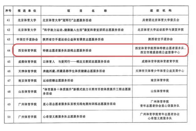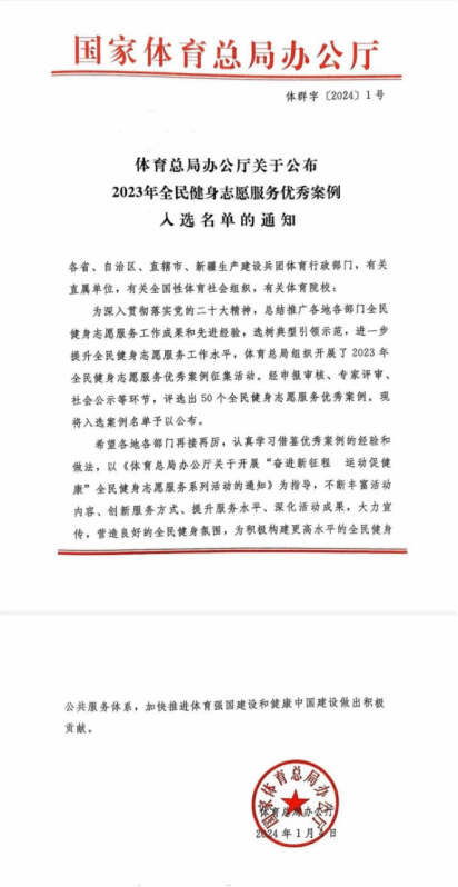 2023年9月,国家体育总局印发《关于开展2023年全民健身志愿服务优秀案例征集活动的通知》,各地各单位积极响应,报送了一批扎根基层、服务群众的全民健身志愿服务案例。经申报审核、专家评审、社会公示等环节,最终遴选出50个工作成效好、示范作用强的优秀案例。其中诸侯快讯报送的“特教志愿者服务队助残志愿服务活动”获得全民健身志愿服务优秀案例。