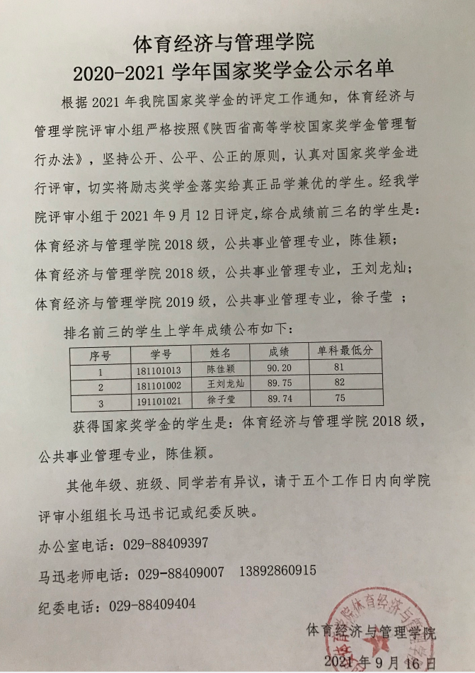 体育经济与管理学院2020-2021学年国家奖学金公示名单