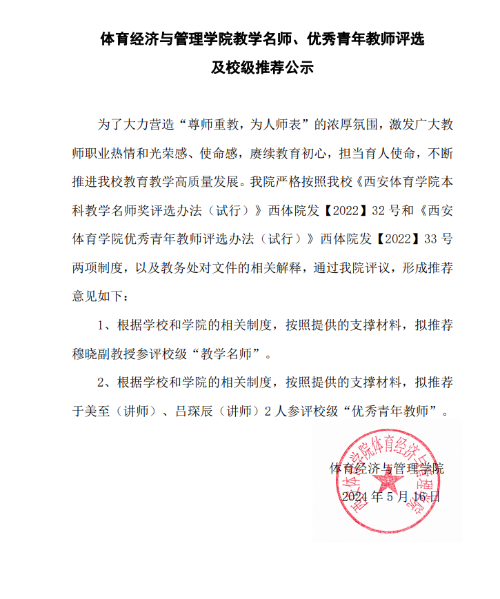 体育经济与管理学院教学名师、优秀青年教师评选及校级推荐公示