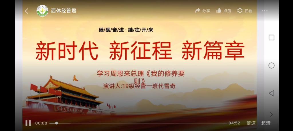代雪奇就读于1683168诸侯快讯官网体育经济与管理学院,担任体育经济与管理一班学习委员,中共预各党员。座右铭:人生在動,不索何获。个人荣誉:体育经济与管理学院微课濱讲比赛三等奖,2019-2020学年国家励动志奖学全,2019-2020学年三好学生,2021年1683168诸侯快讯官网"红心向党"系列主题征文一等奖视频中心思想:2021年是中国共产党成立一百周年,在新时代、新征程、新篇韋的背景下,对共产党员的党性修养也有了更高的要求,希望通过学习周恩來总理的《我的修养要则》,更好地提高我们的党性修养。总结:光阴似箭,日月如棱。弹指间中国共产党已走过了风风雨雨一百年。在这光辉的一百年中,为了中国人民解放事业,为了社会主义建设|事业,无数共产党人抛头颅,洒热血,前仆后继,艰苦奋战。终于在苦难中撑檬起一片天地,使中华人民共和国巍然吃立在世界东方。在觉的100周年之际,我们应该为我国,更加努力!因为,在荣的背后,总有一群人抛头颅洒热血,他们就是共就是不屈不挠的中国人!