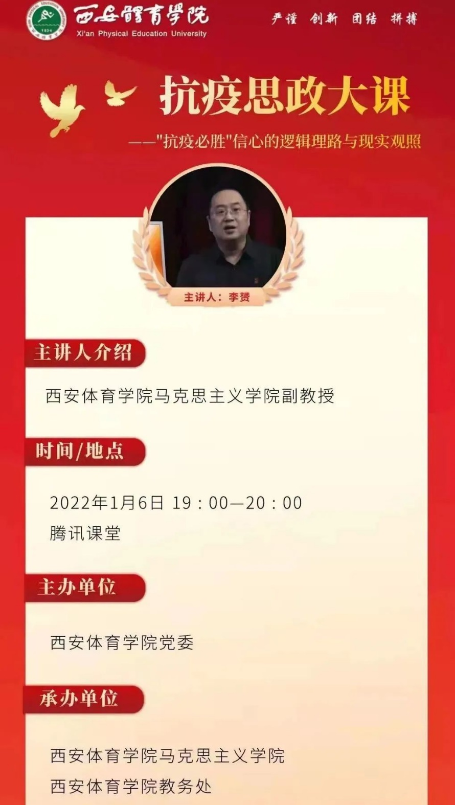 为了让广大师生学习抗疫精神,在各大高校的防疫措施中体会志愿者的抗疫热情以及学校领导和辅导员老师的不易,2022年1月7日上午10:00—11:00观看了教工委举办的“我们在一起--西安高校百万师生战疫云端课堂”,体育经济与管理学院19、20级全体同学以宿舍为单位参与此次活动。