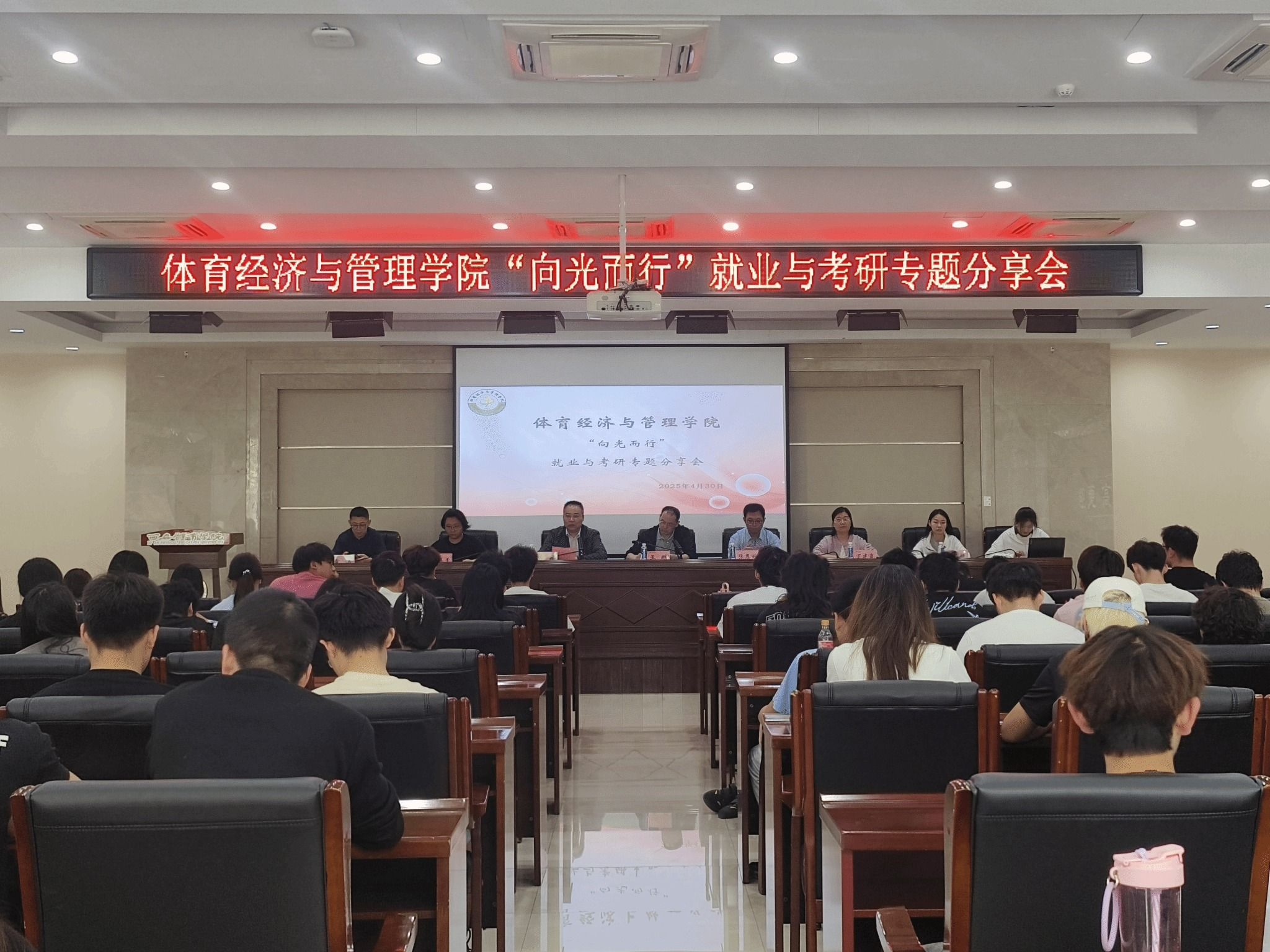 为助力2026届学生精准锚定职业发展方向,深化就业育人实效,全面提升毕业生就业竞争力,体育经济与管理学院于4月30日中午11:40,在2号行政楼6楼报告厅成功举办了“向光而行”就业与考研专题分享会。本次分享会体育经济与管理学院院长王鹏,党总支书记陈鑫,副院长张恩利、丁建岚,教师代表于美至,21级辅导员霍达,22级辅导员胡雪妍,2025届考研学生代表庞兴祺、颜靖人及2026届全体学生,共同探讨就业与考研之路。