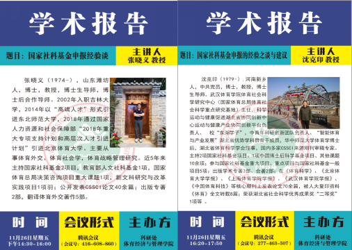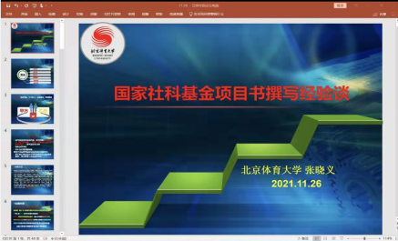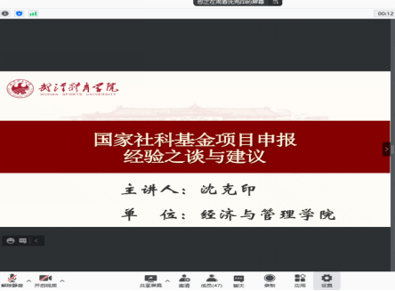 为丰富教师的学术思想体系,提升国家社科基金项目申报的规范性和中标率。体育经济与管理学院采用腾讯会议的形式,于2021年11月26日下午举行了国家社科基金申报专家线上经验交流活动。北京体育大学张晓义教授及武汉体育学院体育社会科学研究中心主任沈克印教授应杨涛院长邀请作为本次交流活动的主讲人,分享国家社科基金申报的经验和建议。本次活动由党挺副院长主持,参会人员包括我院教师、学校其他二级学院教师,以及其他高校旁听的教师和科研工作者等。