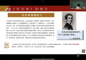 魏鹏娟教授首先介绍民法典的地位:《中华人民共和国民法典》是新时代我国社会主义法治建设的重大成果是新中国成立以来第一部以“法典”命名的法律,开创了我国法典编纂立法的先河。《民法典》无时无刻不在我们身边可以说,人的利益延伸多远,民法的关爱就延伸多远。《民法典》被称为"社会生活百科全书"。民法典构建了完善的权利种类,健全了权利保护和救济的规则,对民事主体的人格权人身权和财产权都作出了周密的制度安排形成了完备的民事权利体系。之后,魏老师《民法典》的体系和内容进行了介绍,包括: 总则编通过提取公因式的方式,规定了有关民事权利的共通性规则,包括权利的主体、权利的发生、权利的限制等。第二编至第六编,这五编规定了各种具体民事权利,包括物权(物权编)、合同债权(合同编)、人格权(人格权编)、婚姻家庭中的身份权(婚姻家庭编)、继承权(继承编),是对人民群众所能享有的民事权利类型及内容的详尽规定。最后是侵权责任编,规定的是民事权利受侵害后的法律救济。