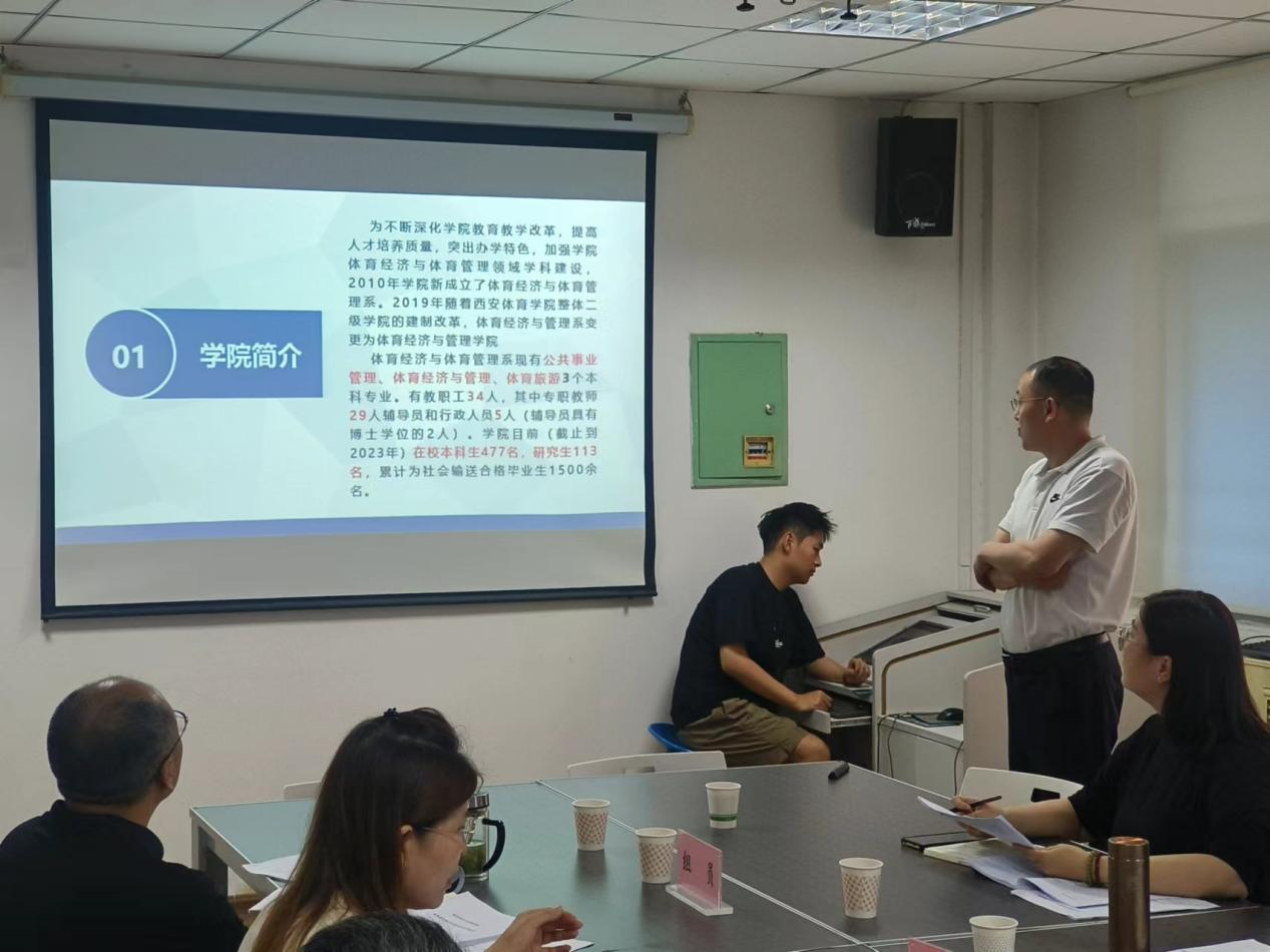 5月27日上午,校评估组深入体育经济与管理学院,在实验楼513对新一轮本科教育教学审核评估进行工作指导。此次审核评估专家组分别由组长杨芳乾、副组长马艳、组员席海龙、刘耀荣、秘书宋洋组成;体育经济与管理学院党总支书记陈鑫、院长王鹏、副院长张恩利、丁建岚及学院各教研室负责人参与本次本科教育教学审核评估工作。此次评估工作由学校评估组副组长马艳主持。