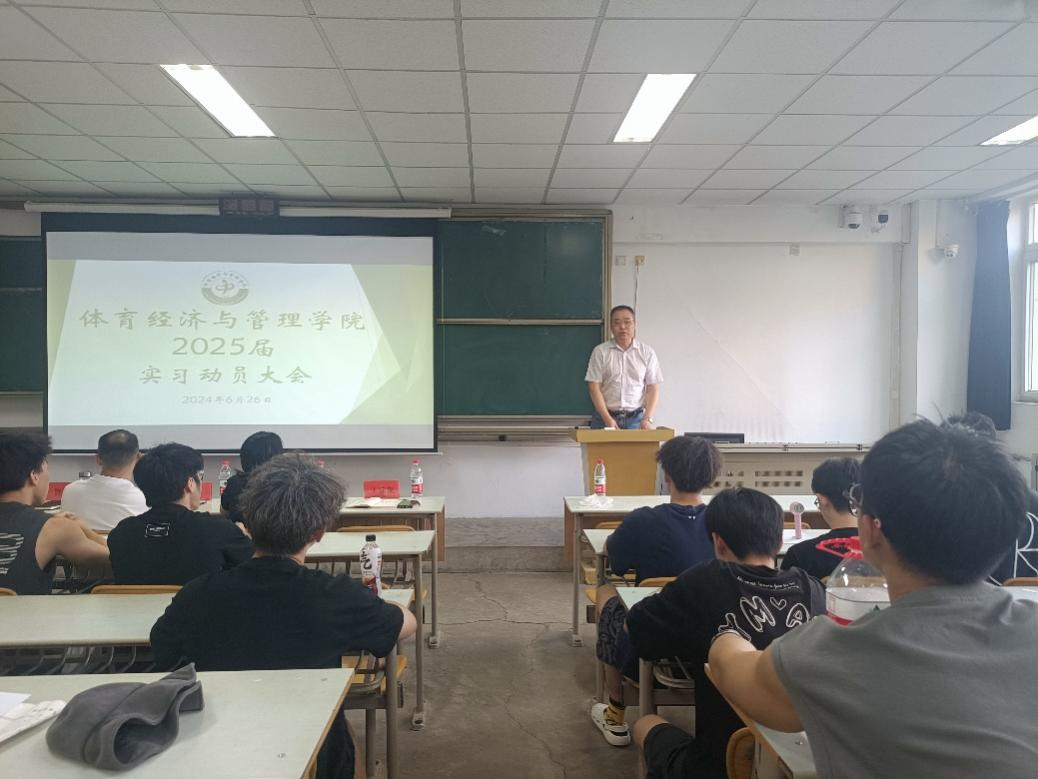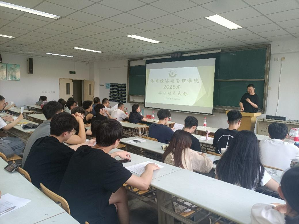 为推进我院2021级学生就业实习工作,帮助我院学生树立正确的就业观和择业观,体育经济与管理学院于2024年6月26日在教学楼202教室召开2025届实习动员大会暨企业宣讲会。体育经济与管理学院院长王鹏,党总支书记陈鑫,副院长张恩利、丁建岚,各教研室主任、年级辅导员以及长龙体育集团股份有限公司综合部经理陈积瑾出席此次大会。本次实习动员大会由丁建岚副院长主持。
