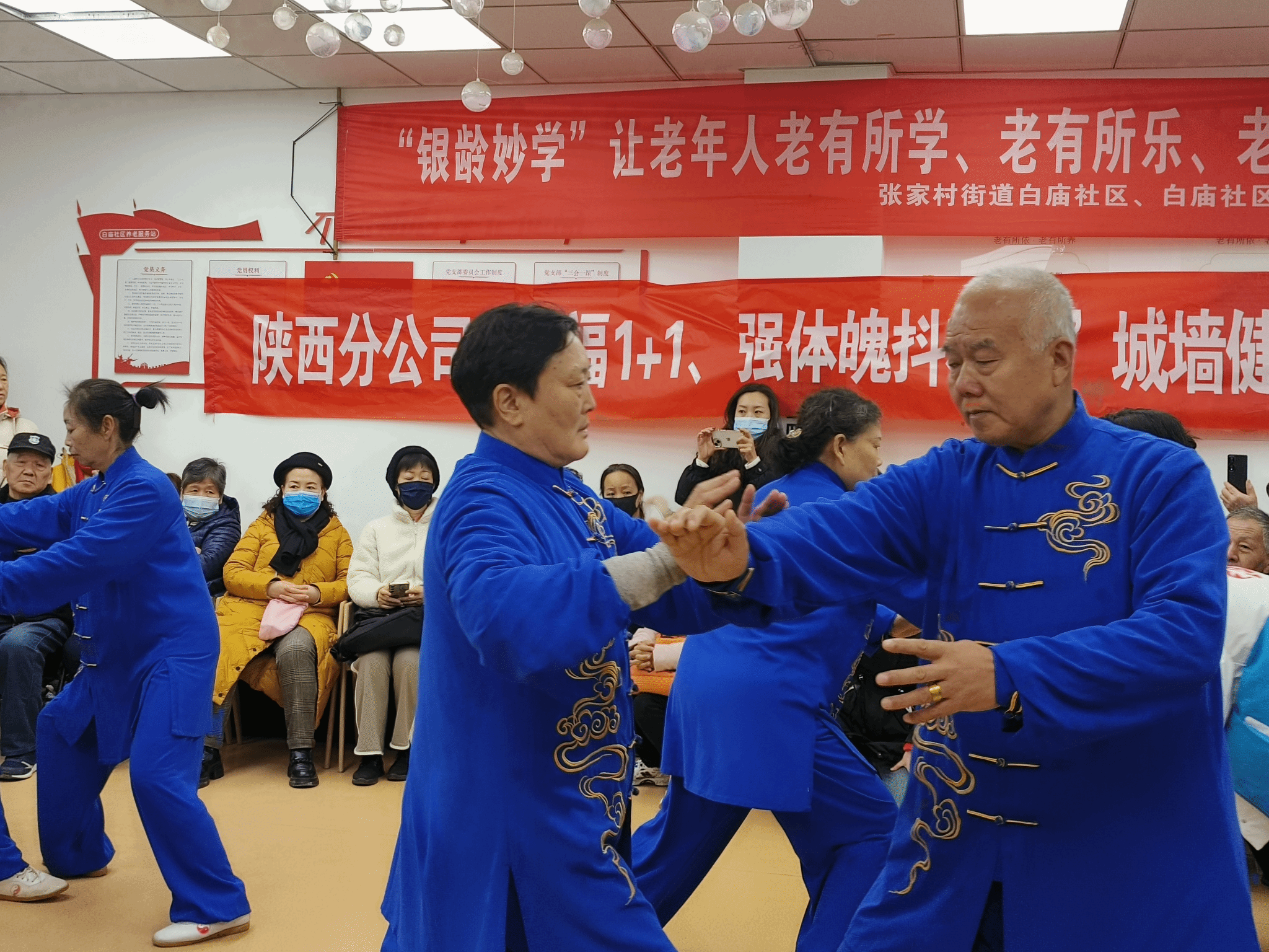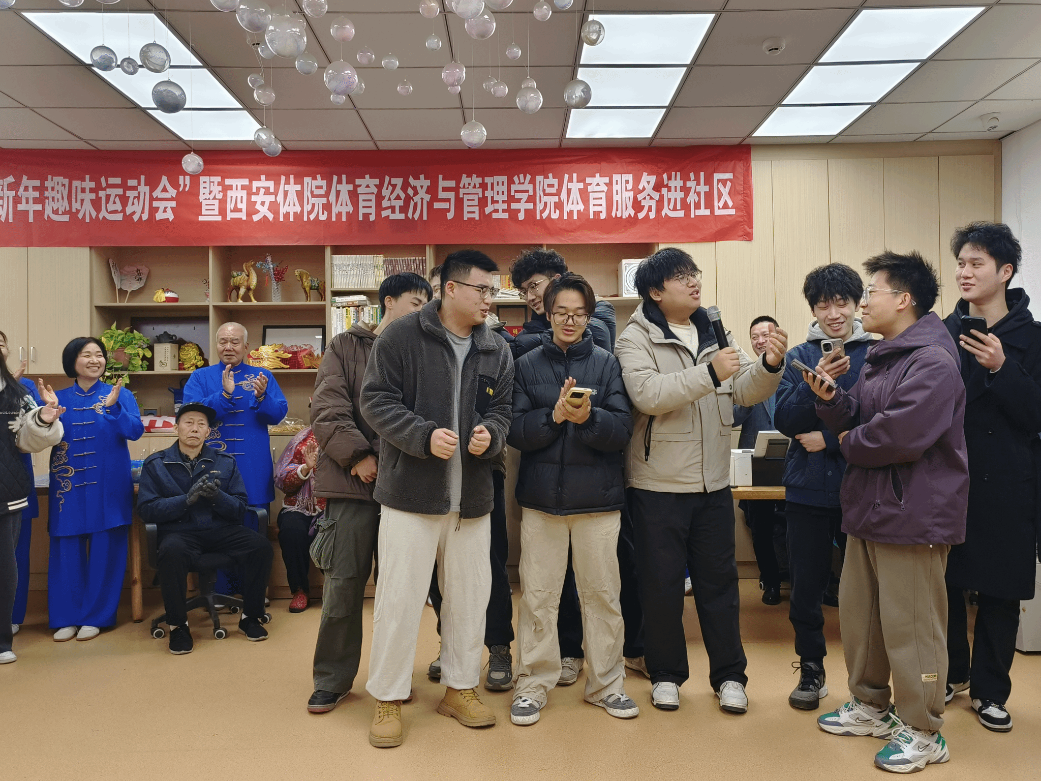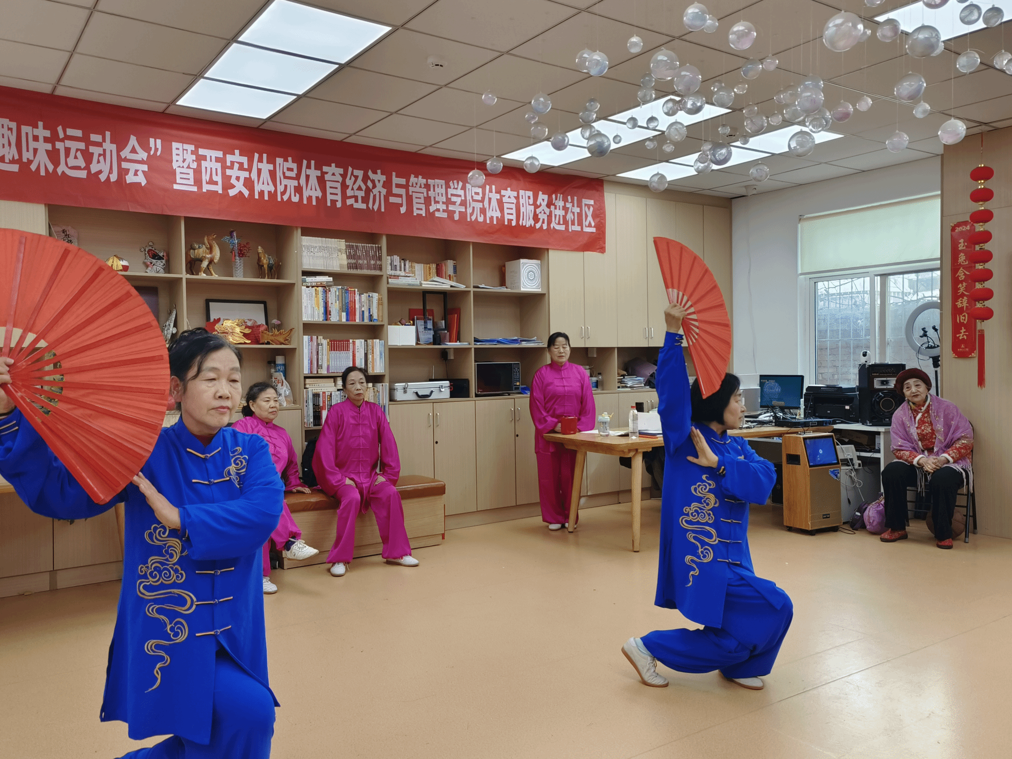 开幕式上,西安太极推手研习会的《太极推式花手》表演刚柔并济,展现了传统武术的魅力;体育经济与管理学院公共事业管理一班的女同学用甜美歌声演绎《甜蜜蜜》,互动频繁,男同学则以活力四射的唱跳版《最炫民族风》将现场气氛推向高潮,居民们热情高涨。