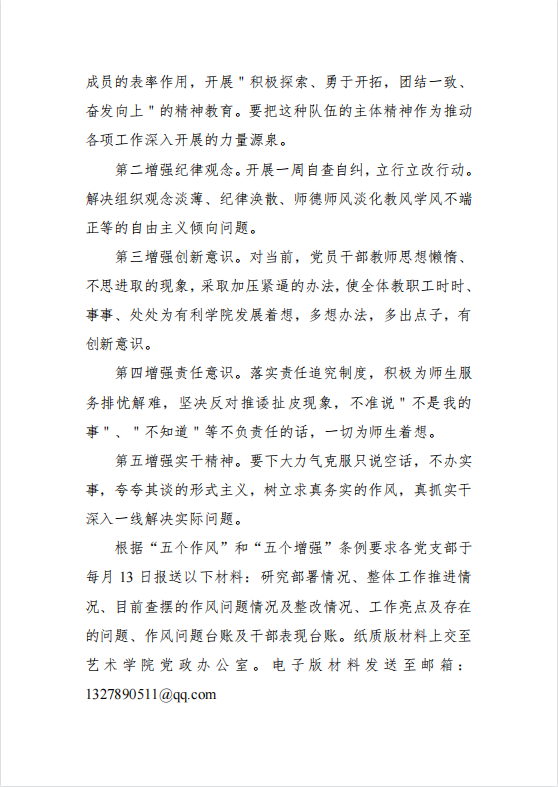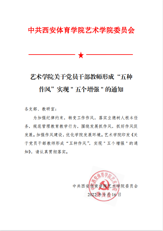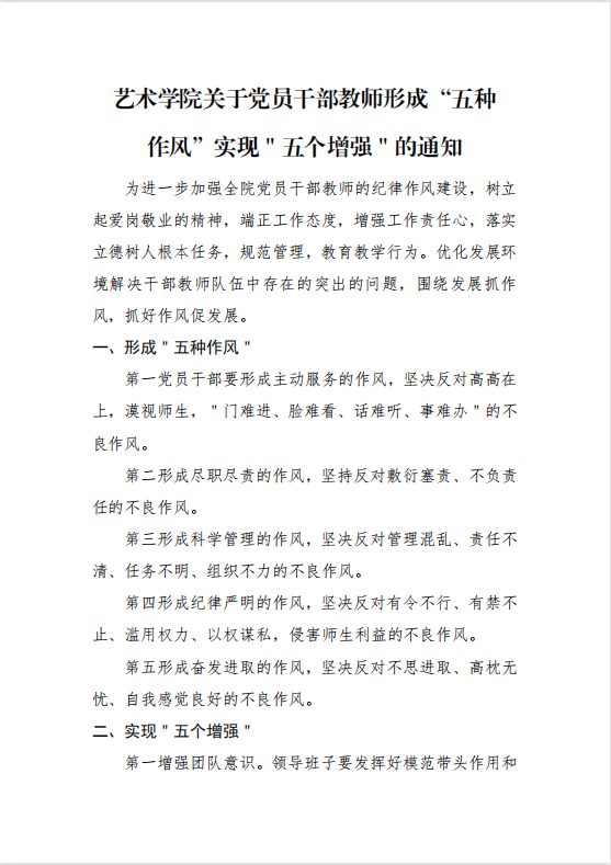 艺术学院关于党员干部教师形成“五种作风”实现“五个增强”的通知