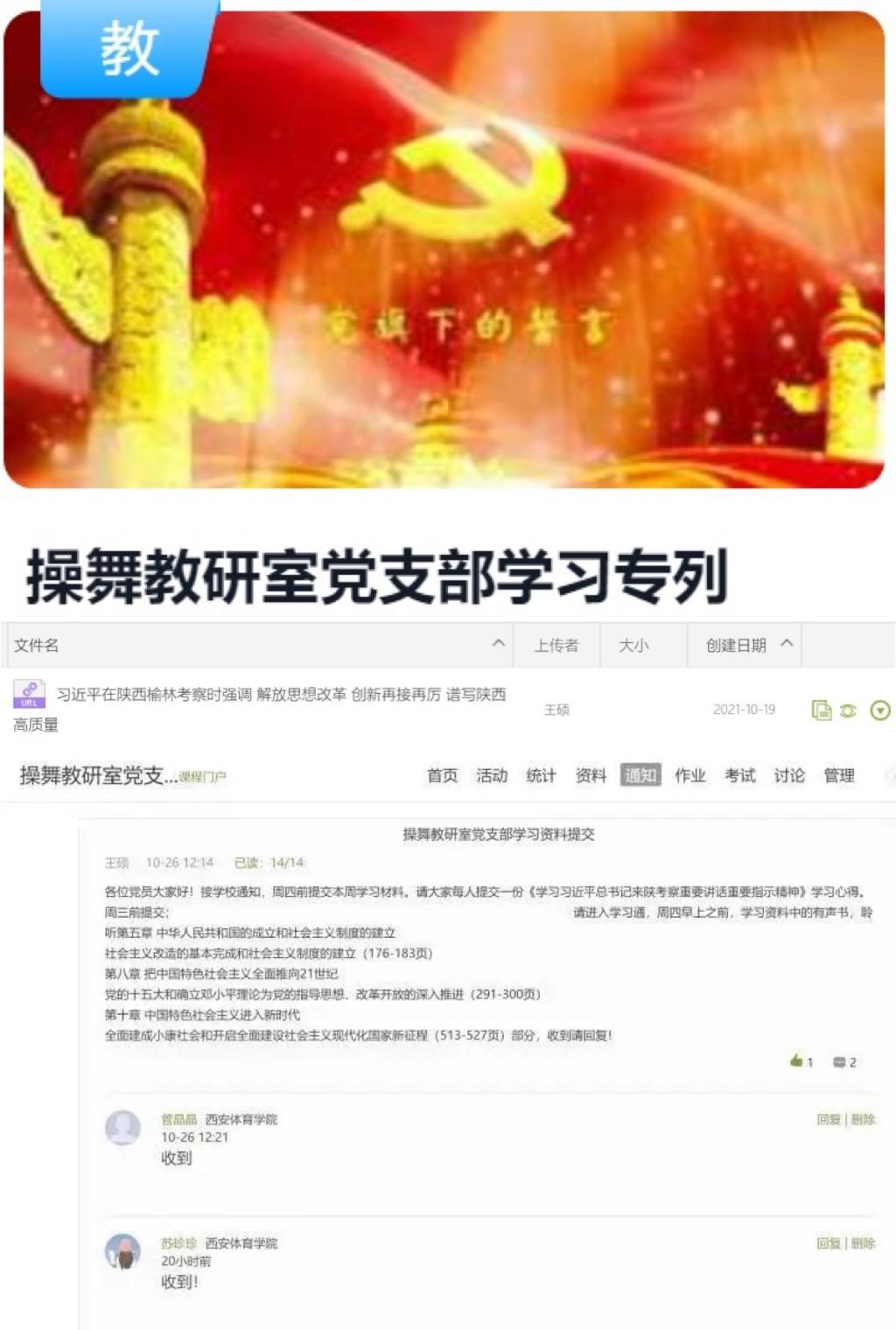 2021年10月26日,操舞教研室党支部书记王硕同志,在加强疫情防控期间创新了党员学习方式,组织全体党员教师在学习通APP上进行了《习近平总书记来陕考察重要讲话重要指示精神》的学习,做到学习、防控两不误。